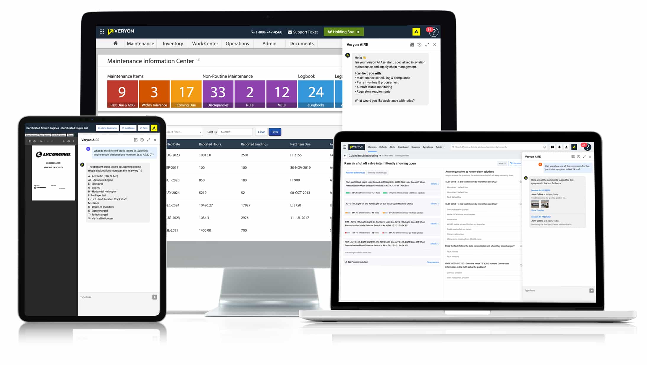 - Veryon Tracking: VeryonAIRE acts as a conversational AI interface that allows operators to interact directly with their maintenance and inventory data, including viewing aircraft maintenance status, managing inventory and planning for maintenance, and staying continuously compliant.